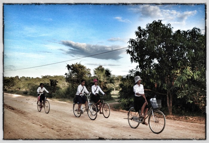 Just one today: Village girls cycle to school in Kompong Thom Province: