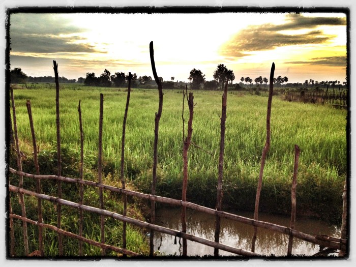 The noodle maker runs a simple guesthouse in a remote Cambodian village. He wears only a krama (scarf) as a sarong. Cows and pigs live behind his house. He gets water from a well and showers by dipping rainwater from a large clay pot (as did Chantha and I that night). He has an actual toilet, possibly one of the few in his village. A small TV flickers in his guesthouse “bunkroom” and plays Khmer music videos into the night. And every morning, he rises with the roosters (about 3am) to make rice noodles by hand with his wife and kids to sell in the nearby market. That photo series and story coming soon. He supports his family and his mother by selling homemade noodles and running a guesthouse that sees occasional visitors (like us). And I assume that, like most or all of his neighbors, he also grows rice.