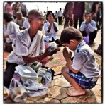 Mourning Norodom Sihanouk — Thousands of mourners gather to remember former king Norodom Sihanouk by the Royal Palace in Phnom Penh. Monks pray, students offer lotus blossoms and incense, and a Buddhist nun bestows blessings upon a small boy.